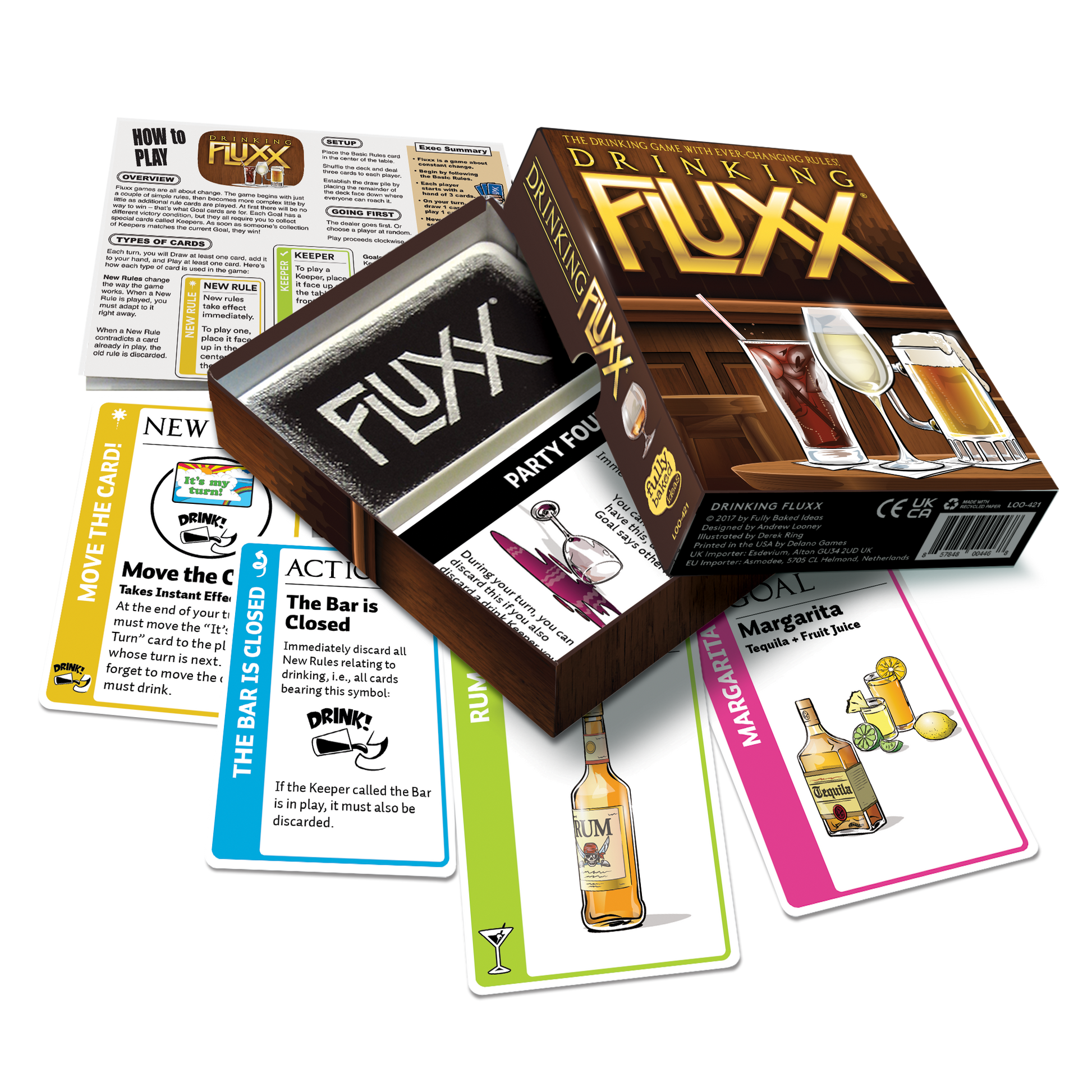 Fluxx turned 21, and we celebrated by publishing Drinking Fluxx! With rules that are always changing, Drinking Fluxx will keep you on your toes and shake up any adult party. You've never played a drinking game like this before! It's fun, it's unpredictable, and its plastic cards are spill proof! Drinking Fluxx is published under our adult games imprint, Fully Baked Ideas, and will not be listed in the Looney Labs family games catalog. Players: 2-6 players | Ages: Adults only