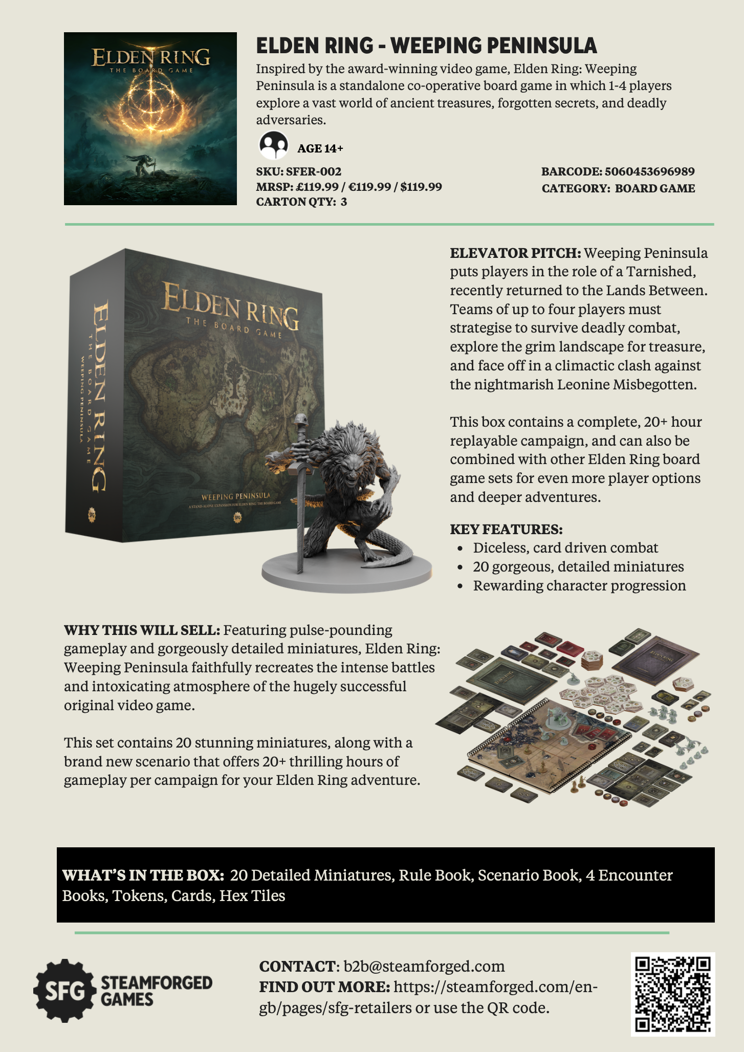 Players: 1-4 • Playing Time: 120+ • Age: 14+ Rise, Tarnished, and draw your cloak tight against the wind’s deathly chill. Named for its never-ending rainfall, the Weeping Peninsula that lies south of Limgrave is a melancholy land filled with hidden secrets, powerful artifacts, and grave danger. All who set foot on this cursed headland are sure to cross paths with a host of misbegotten creatures, determined to cast out any Tarnished foolish enough to intrude.