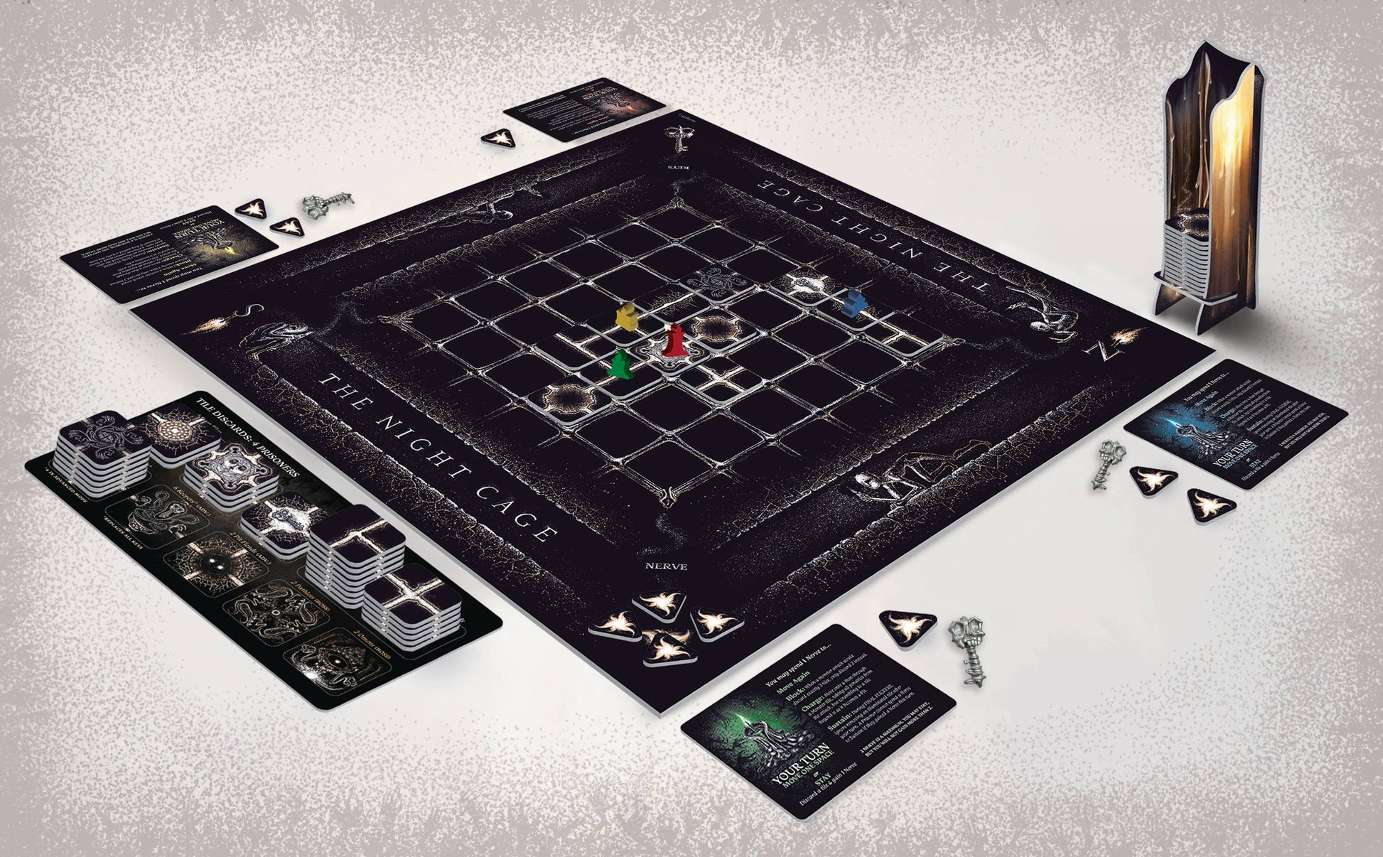 The Night Cage is a cooperative, horror-themed, tile-placement game that traps 1 to 4 lost souls within an otherworldly labyrinth of eternal darkness. Each prisoner has only a candle to aid them in their escape. But its weak light can only illuminate the passages directly adjacent to them. As players move, new pathways are revealed while old ones disappear, consumed in the darkness forever.